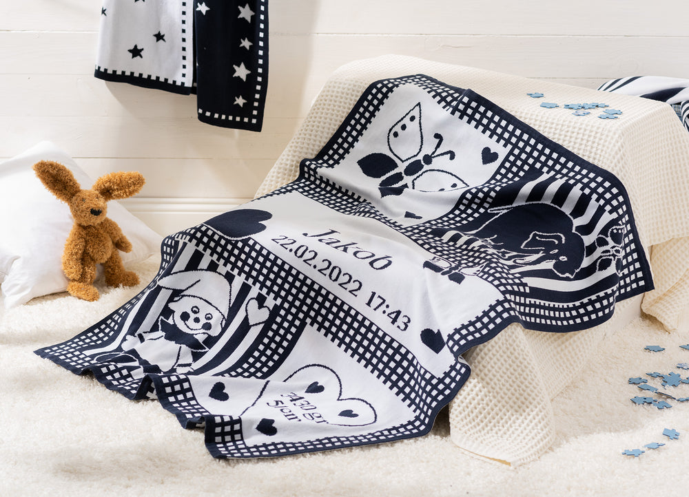 Liebevoll gefertigte Babydecken mit eingestrickten Herzensdaten. Zum Kuscheln, Erinnern & Liebhaben.