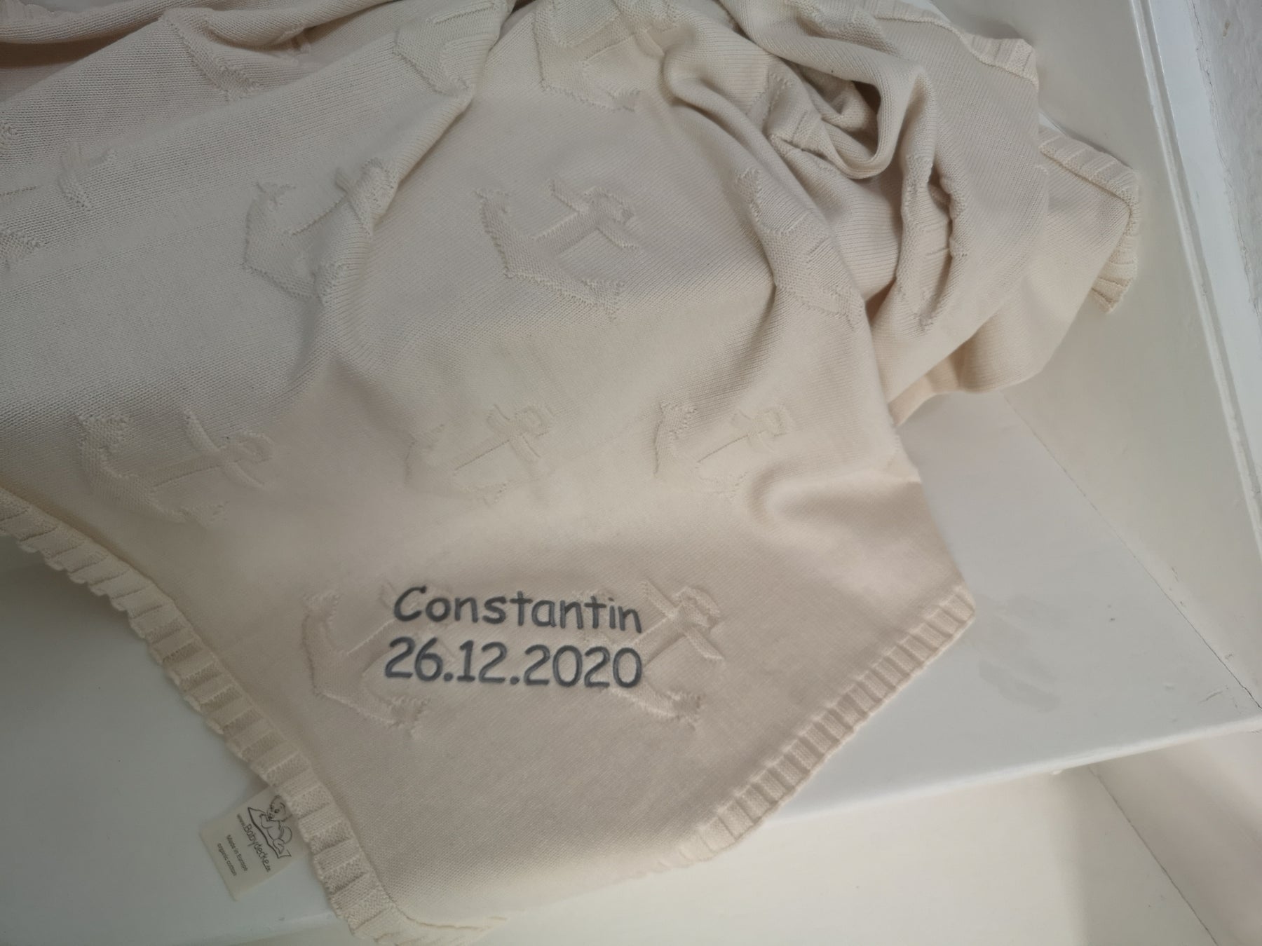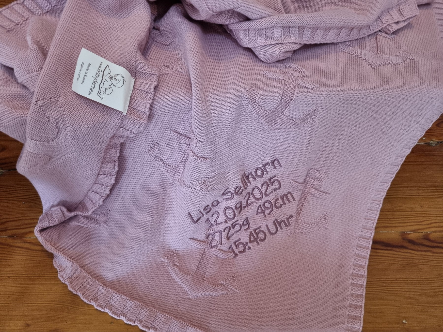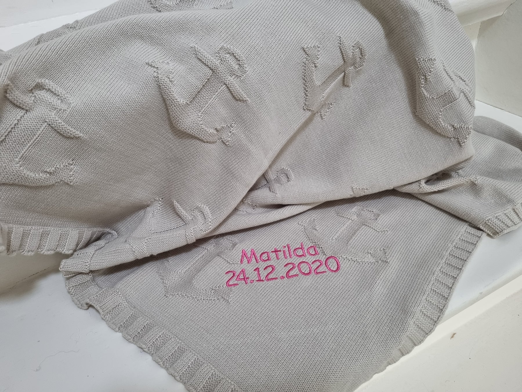 Babydecke ANKERPLATZ in 11 tollen Farben mit dem Namen und/oder den Wunschdaten bestickt. Stickfarben gibt es ebenfalls 11 zur Auswahl.